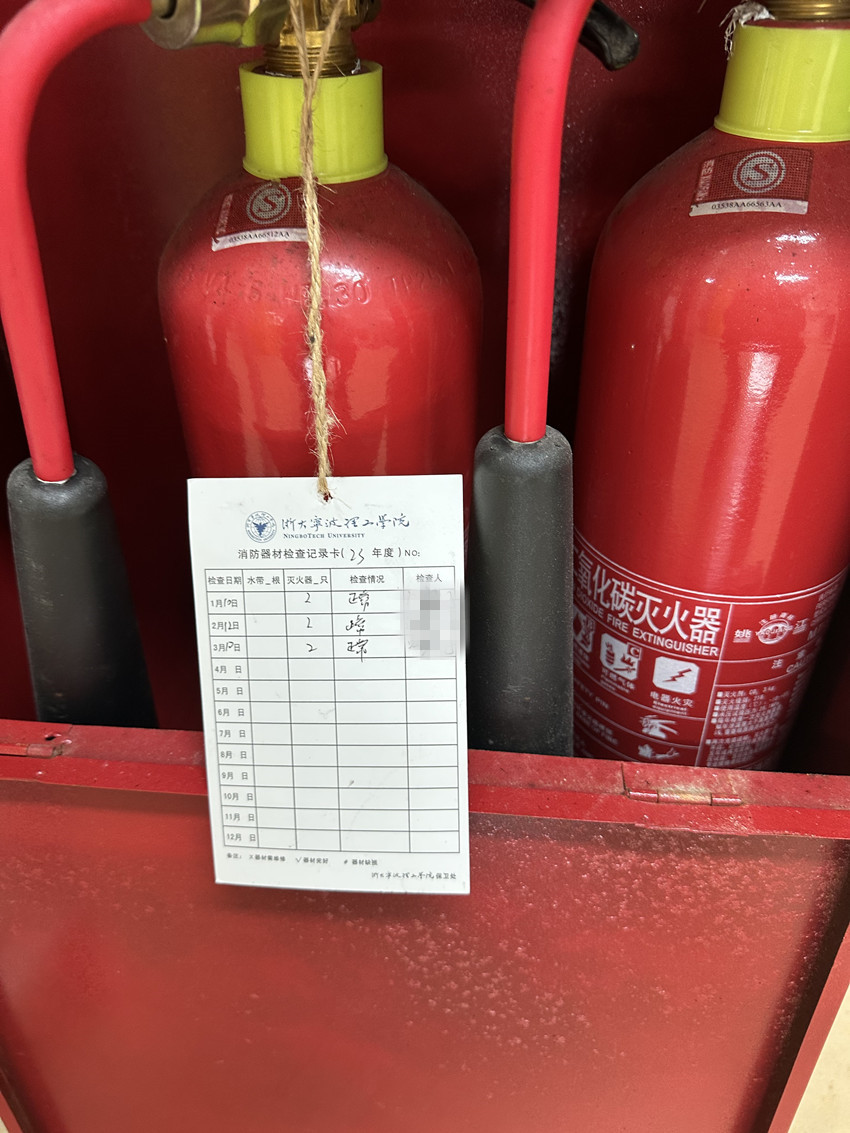 3、个别实验室灭火器未按规定定期检查有效情况。