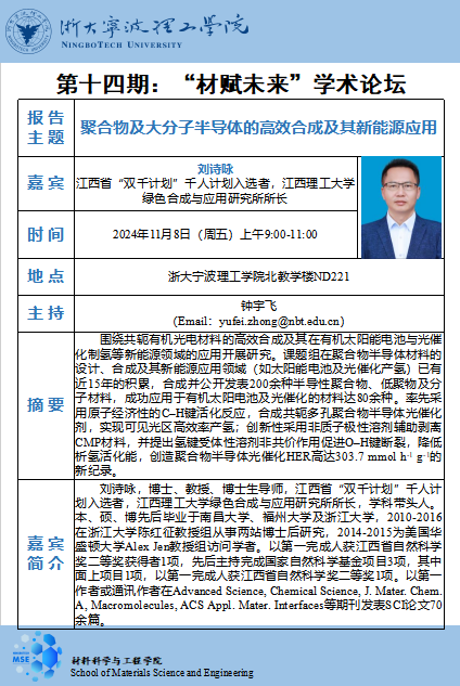 主讲嘉宾:刘诗咏(江西省“双千计划”千人计划入选者,江西理工大学绿色合成与应用研究所所长)